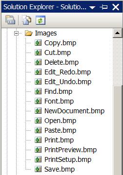 Вызовите для папки Images контекстное меню и командой Add/Existing Item скопируйте в нее иконки с расширением .bmp из папки Source: