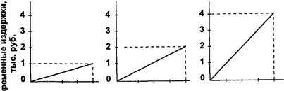 На рис. 1 показаны три графика поведения суммарных переменных издержек в расчете на заданный объем производства. Каждый из графиков имеет свой угол наклона к горизонтальной оси, зависящий от величины переменных издержек на единицу продукции. Чем меньше угол наклона графика издержек, тем выгоднее бизнесу: небольшие переменные расходы на единицу продукции связывают меньше оборотного капитала и обещают более значительную прибыль.