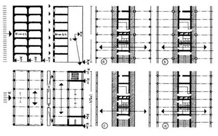 | 13. Пространственная жесткость придана зданию с помощью рамных конструкций, передающих усилия от ветровой нагрузки на фундаменты. 14. Пространственная жесткость придана зданию с помощью жестких поперечных стен. 15. Четыре возможных варианта передачи вертикальных нагрузок на колонны и среднее несущее ядро здания (при двухкоридорной схеме планировки). |