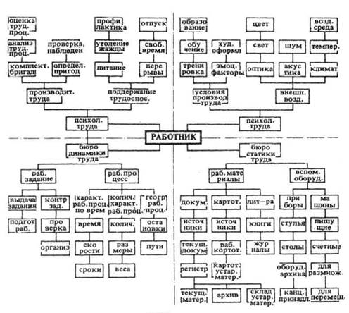 | 1. Схема организации труда в учреждении. Верхняя часть схемы относится к любому виду трудовой деятельности, нижняя— только к конторской работе. Задачи, указанные в левой половине схемы, могут быть решены посредством профилактических и педагогических мероприятий; задачи, указанные в правой половине схемы, большей частью могут быть решены посредством мероприятий технического и организационного характера. |