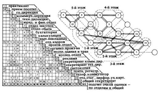 | 6. Таблица к выбору планировочного решения здания. Оценивая числом условных очков пути движения служащих с учетом их заработной платы в 1 ч, составляют схему коммуникаций 7. Треугольная схема. Схематическое распределение отделов в соответствии с числом условных очков и требуемой для них площадью. |