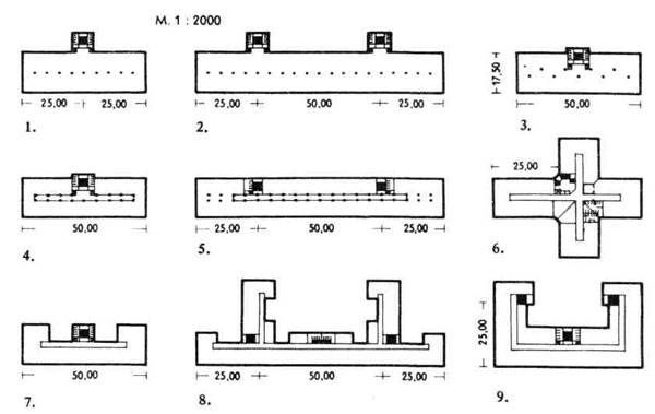 | Крупные конторские здания, как правило, многоэтажные, проектируемые с учетом перемещения передвижных перегородок, устраиваемых на всю высоту помещений. Санитарные узлы, лестничные клетки, шахты лифтов и т.п. располагают либо на расстоянии, соответствующем Строительным правилам***, в пристройках к основному объему здания (рис, 1 и 2), у одной из сторон здания (рис. 3—5), во входящих углах (рис. 6, 10—12, 15, 16), в концах отдельных крыльев здания (рис. 8, 9, 11, 12, 14), либо между коридорами возле светового дворика (рис. 17—21) с тем, чтобы в планировке здания выделить максимально допустимый по длине непрерывный ряд взаимосвязанных рабочих помещений. Расположение опор в один ряд по оси здания (рис. 1 и 2) позволяет размещать коридор справа или слева от опор в зависимости от необходимости устройства помещений той или иной площади. Расположение опор в два ряда (рис. 3—6) даёт возможность устройства помещений одинаковой глубины. Коридоры при этом освещаются вторым светом через фрамуги и остекленные двери в перегородках. Наиболее экономичным является торцовое освещение коридоров в зданиях небольшой протяжённости (рис. 13), в зданиях с поперечными крыльями (рис. 10 и 11), в зданиях Г-образной формы (рис. 12), Т-образной формы (рис. 15), П-образной формы в плане (рис. 16), в зданиях сложной конфигурации со смешанными в плане корпусами и крестообразной формой основной части здания, в центре которой размещены шахты для группы лифтов. Боковое освещение коридоров через световые разрывы менее экономично (рис. 7 и 8). При строительстве зданий на глубоких дорогостоящих участках, где по экономическим соображениям приходится увеличивать ширину корпусов, целесообразно коридоры и подсобные помещения, архивы, санитарные узлы и гардеробы размещать около световых двориков (рис. 17—20). Во входящих углах зданий размещают лестничные клетки, шахты лифтов и санитарные узлы; в лишенных естественного освещения частях здания располагаются тёмные комнаты, сейфы и кладовые (рис. 10, 11 и 19). *** Согласно § 17 «Единых строительных правил», расстояние от каждого помещения, предназначенного для длительного пребывания людей, до лестничной клетки должно превышать 25 м (считая от середины помещения до двери лестничной клетки). 21. Согласно западноберлинским Строительным правилам, § 17, расстояние от любой точки каждого из помещений для длительного пребывания людей до выхода на лестницу не должно превышать 30 м, в связи с чем обычно лестничные клетки размещают на расстоянии 25 м от торцов здания и на расстоянии 50 м друг от друга. |