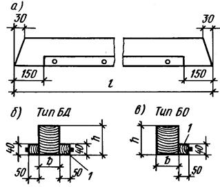 Рис. 9.3. Деревянные балки с черепными брусками: а – общий вид; б и в – поперечные сечения балок; 1 – черепной брусок.