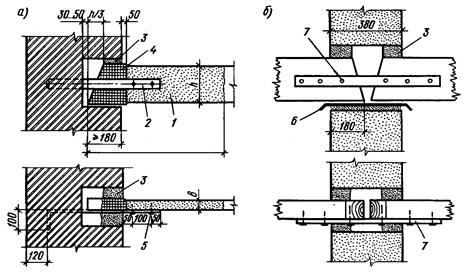 Рис. 9.4. Опирание деревянных балок на каменные стены: 1 – антисептиро-ванная часть балки; 2 анкер; 3 – заделка раствором; 4 – два слоя толя на смоле; 5 – гвоздь; 6 – два слоя толя; 7 – стальная накладка 50х6мм.