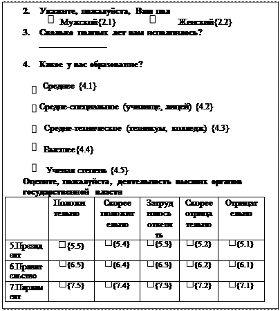 Первое – в анкете мы видели 4 вопроса, однако при нумерации переменных у нас получилось 7 переменных. Дело в том, что четвертый вопрос анкеты представляет собой фактически объединение трех переменных (отношение к Президенту, отношение к Правительству и отношение к Парламенту), каждая из которых может принимать случайные значения. По этой причине мы не имеем права объединять эту переменную в одну. Кроме того, выше мы отмечали, что необходимо пронумеровать сами анкеты. По этой причине вопросы начинают нумероваться с цифры 2. Первая переменная – это порядковый номер анкеты.