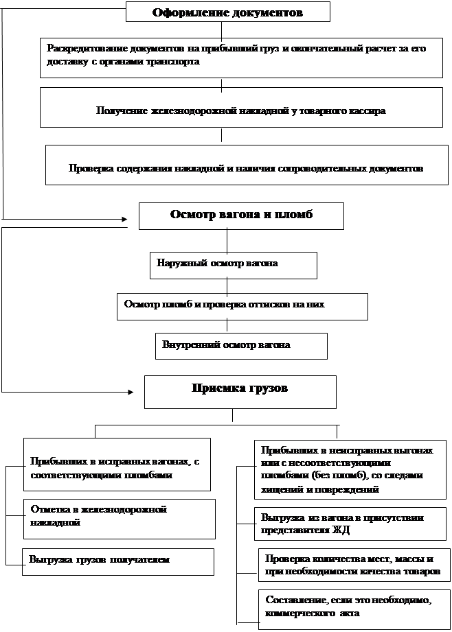При поступлении груза в исправном вагоне с соответствующими пломбами железная дорога выдает груз без проверки количества и массы, о чем делается отметка в железнодорожной накладной. Комиссия получателя после тщательного наружного осмотра вагона и пломб, вскрывает вагон (пломбы сохраняются до конца приемки), организует выгрузку и одновременно производит проверку количества и массы поступившего товара. Вскрытие вагона или контейнера оформляется специальным актом, а масса взвешиваемого товара фиксируется в акте взвешивания. Если в результате приемки установлены расхождения с данными сопроводительных документов, оформляется акт приемки в соответствии с инструкциями № П-6 и № П-7 и на основании акта приемки претензия направляется поставщику товара.