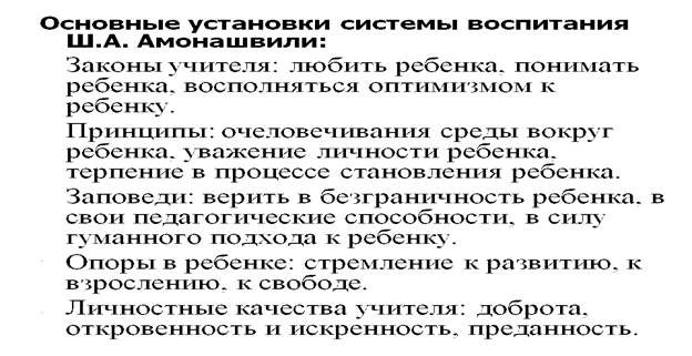 Педагогическая и дидактическая система Ш.А. Амонашвили проникнута гуманным отношением к детям, основана на чувстве уважения к ним, взаимной любви учителя и учащихся.