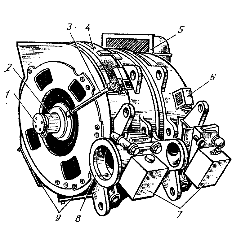 1-гайка специальная с пружинной шайбой; 2- вал якоря; 3- трубка для смазки якорных подшипников; 4- крышка верхнего смотрового люка; 5 – большой выхлопной кожух; 6 – малый выхлопной кожух; 7,8 – букса и вкладыш моторно-осевого подшипника; 9 - нижние смотровые люки