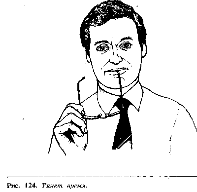 Почти любое вспомогательное средство, используемое человеком, может разоблачить человека и раскрыть его мысли, если учитывать те характерные жесты, которые проделываются с этим предметом. Это можно сказать и об очках. Один из наиболее характерных жестов - это заложение дужки оправы в рот (рис. 124).