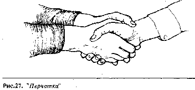. Существует несколько способов обращения с доминантным рукопожатием. Вы можете пользоваться описанным выше способом, основанным на цепочке шагов, но иногда его трудно применять, т.к. обычно рука автора жеста бывает жесткой и напряженной, что не позволяет провести такой маневр. Очень простой способ - обхватить руку человека сверху за запястье и затем встряхнуть ее (рис.26). При таком способе вы становитесь хозяином положения, т.к. берете верх над рукой другого человека, а так как. это может сбить с толку человека с властными намерениями, мы рекомендуем использовать это рукопожатие с определенными мерами предосторожности.
