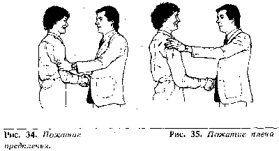 выразить инициатор, используется левая рука, которая кладется на правую руку реципиента. Степень этой переполненности будет выражаться местом, на которое кладется рука. Например, если левая рука инициатора берется за локоть партнера (рис.33), то это выражает больше чувства, чем при обхватывании запястья'(рис.32). Если рука кладется на плечо (рис.35), то это выражает больше чувства, чем когда она находится на предплечье (рис.34). Во-вторых, поведение левой руки инициатора означает нарушение интимной и особо интимной зон реципиента. В общем, обхватывание запястья и плеча возможно лишь между близкими друзьями, родственниками и лишь в том случае, если левая рука инициатора проникает только в интимную зону, не затрагивая особо интимной зоны.
