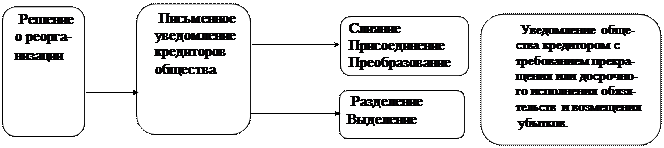Общие основания реорганизации акционерного общества предусмотрены ГК РФ. Закон "Об АО" устанавливает, что принятие решения о реорганизации, так же, как и о ликвидации, находится в исключительной компетенции общего собрания акционеров, большинством в 3/4 голосов акционеров-владельцев голосующих акций, присутствующих на данном общем собрании акционеров. АО по общему правилу обязано оповестить своих кредиторов о реорганизации АО – 30 дней с даты принятия решения о реорганизации АО. Установлены также сроки, в течение которых кредиторы АО вправе требовать прекращения или досрочного исполнения обязательств и возмещения убытков путем письменного уведомления: