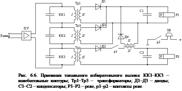 Рассмотрим схему приемника тонального избирательного вызова (рис. 6.6).