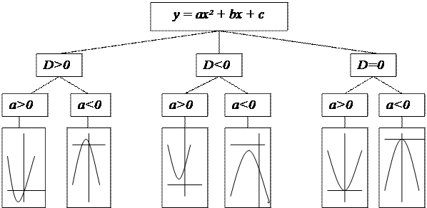 12. у=ах2 + bх + с функциясының сызбасы D-ның, және а-ның мәндеріне байланысты жіктелген. Осы жағдайлардың әрқайсысына нақты мысалдар келтір.