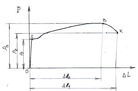 На полученных индикаторных диаграммах (диаграммы привести в отчете по лабораторной работе) нанести характерные точки S, B и K, провести оси координат (рисунок 3). По данным таблицы 1 определить абсолютное удлинение DlK, площади поперечных сечений до деформации (F0) и соответствующие характерным точкам B (FB,) и К (Fш) диаграммы. Результаты занести в таблицу 2.