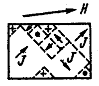 Как отмечалось, в полностью размагниченном материале весь объем составляющих его кристаллов поровну разделен между доменами с противоположно направленными векторами спонтанной намагниченности. В результате этого намагниченность материала, а значит, и индукция относительно внешней среды равны нулю. На рисунок 2.7,а условно изображен один из кристаллов, где стрел ки обозначают направления намагниченности отдельных доменов.