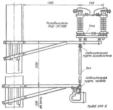 Разъединители монтируют на специальных штыревых изоляторах. Изоляторы устанавливают на специальной раме вертикально. Один из них является неподвижным, а второй с помощью специального вала в нижней части может отклоняться от вертикального положения. При переводе рычагом подвижного изолятора в наклонное положение нож выходит из губок и разрывает цепь. Плотное зажимание ножа губками обеспечивается стальными пружинами. Провода к каждой головке разъединителя присоединяют болтовыми зажимами, рассчитанными на четыре провода сечением до 120 мм2 каждый.