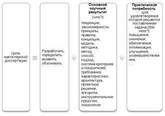 Так, в магистерских диссертациях при формулировании цели рекомендуется сначала указать основной научный результат, который должен быть получен, а затем связать его с практической потребностью, для удовлетворения которой осуществляется решение поставленной задачи