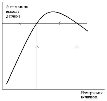 Основным требованием к функции преобразования любых датчиков (исключая релейные) является ее монотонность. Монотонность функции преобразования гарантирует однозначность, получаемой на его выходе величины, от входного воздействия. Датчиком, не обладающим монотонной функцией преобразования, пользоваться невозможно, потому что в случае использования такого датчика нельзя по получаемому на его выходе значению сигнала, определить какому именно значению измеряемой величины он соответствует. Это иллюстрируется рис..