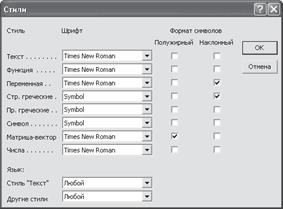 Изменить стиль, установленный автоматически, можно, воспользовавшись соответствующим пунктом меню Стиль. Для изменения параметров, заданных по умолчанию, предназначен пункт Определить. В появившемся окне можно установить параметры форматирования символов для разных стилей. Флажки в столбце Формат символов определяют наличие полужирного или курсивного начертания. При изменении параметров после нажатия кнопки ОК будут обновлены все используемые в документе стили с учетом сделанного выбора, а также по-новому будут отформатированы все формулы. В формулах документов изменения будут отображены только после их повторного открытия в редакторе формул.