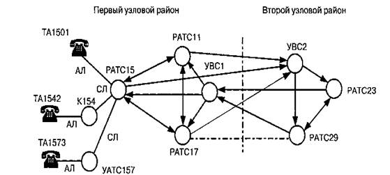 При большом взаимном тяготении и при наличии технической возможности между некоторыми РАТС разных узловых районов могут использоваться прямые (не проходящие через УВС) пучки СЛ. Такой вариант показан штрихпунктирной линией для РАТС17 и РАТС29.