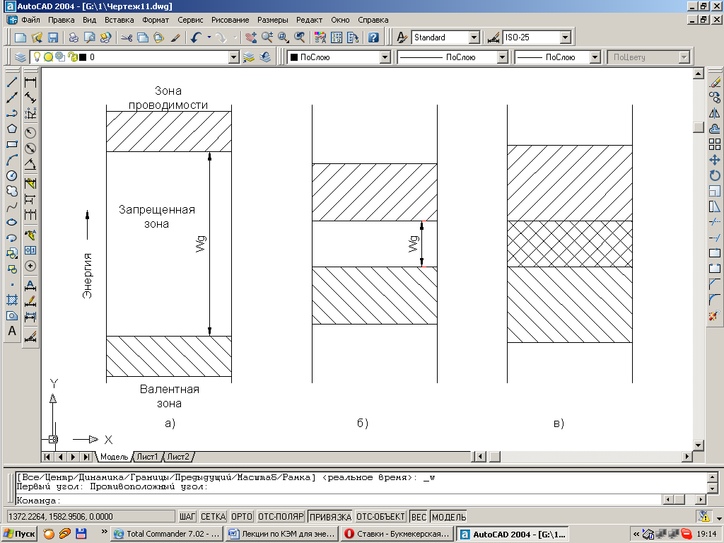 | Рис. 5.2. Картина энергических зон: а) – в изоляторе; б) – в полупроводнике; в) – в металле. |
