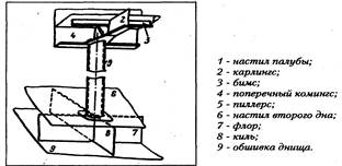 Вертикальные, отдельно стоящие стойки круглого или иного сечения, называются пиллерсами.Пиллерс служит для подкрепления палубы и в своей нижней части упирается в места пересечения флор (шпангоутов - на малых судах) с днищевыми продольными балками (киль, стрингер, кильсон), а в верхней части - бимсов с карлингсами.