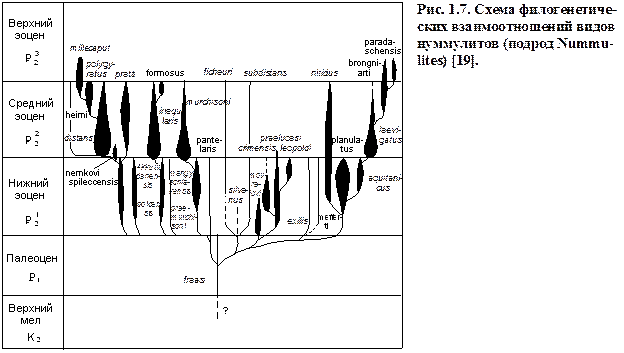 При установлении родственных связей пользуются сравнительно-анатомическим и сравнительно-эмбриологическим методами. С помощью первого на основании сходства элементов скелета прослеживается происхождение древних земноводных ихтиостигид от кистепёрых рыб. Применение второго базируется на установлении стадий развития одной особи от зародышевого до взрослого состояния, т.е. её онтогенез – индивидуальное развитие организма. Онтогенез является упрощённым повторением филогенеза (исторического развития предков данной формы). По отдельным, далеко неполным сохранившимся признакам предковых в эмбриональной части изучаемой особи удаётся установить её предков. Сравнительно-эмбриологический анализ можно применять к тем группам вымерших организмов, у которых сохраняются начальные стадии развития (аммониты, брахиоподы, фораминиферы, кораллы). Так, у некоторых аммонитов начальные обороты раковин имеют гониатитовую линию, а последние – аммонитовую. Выявленные родственные связи можно изобразить в виде схемы филогенетических взаимоотношений (рис. 1.7). Разработав филогенез какой-либо группы организмов, можно расчленить отложения по уровню развития заключённых в них форм. Особое внимание при этом следует обратить на момент появления новых видов, что позволит проводить границы выделяемых стратиграфи-