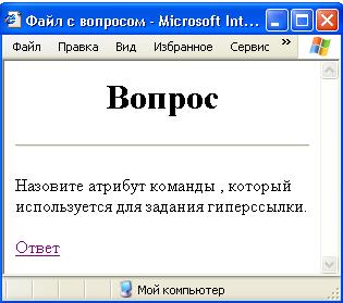 | Doc1.htm <HTML> <HEAD> <TITLE>Файл с вопросом</TITLE> </HEAD> <BODY> <H1 align=center>Вопрос</H1> <HR> <P> Назовите атрибут команды <A>, который используется для задания гиперссылки. <P> <A href=./doc2.htm>Ответ</A> </BODY> </HTML> | Doc2.htm <HTML> <HEAD> <TITLE>Файл с ответом</TITLE> </HEAD> <BODY> <H1 align=center>Ответ</H1> <HR> <P> Для задания гиперссылки используется атрибут href команды <A>. <P> <A href=./doc1.htm>Вернуться к вопросу</A> </BODY> </HTML> |