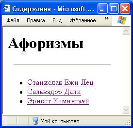 | Doc3.htm <HTML> <HEAD> <TITLE>Содержание</TITLE> </HEAD> <BODY leftmargin=300> <H1 align=center> Афоризмы </H1> <HR width-=200> <UL> <LI> <A href=./doc4.htm#1> Станислав Ежи Лец</A> <LI> <A href=./doc4.htm#2> Сальвадор Дали</A> <LI> <A href=./doc4.htm#3> Эрнест Хемингуэй</A> </BODY> </HTML> | Doc4.htm <HTML> <HEAD> <TITLE>Афоризмы</TITLE> </HEAD> <BODY leftmargin=200> <A name=1> <H1 align=center> Станислав Ежи Лец </H1> <P align=center> Будь альтруистом – уважай эгоизм других. <HR> <P align=center> Могло быть хуже. Твой враг мог быть твоим другом. <HR> <P align=center>Оптимизм и пессимизм расходятся только в точной дате конца света. <A name=2 <H1 align=center> Сальвадор Дали </H1> <P align=center>Если ты способен на жестокость, значит, способен работать. <HR> <P align=center> Когда гении перемрут, я останусь в гордом одиночестве. <HR> <P align=center> Я не тщеславен, напротив, скромен. И если говорю, что я лучше других, то только потому, что они совсем плохи. <HR> <P align=center> Разница между мной и сумасшедшим в том, что я не сумасшедший. <A name=3> <H1 align=center> Эрнест Хемингуэй</H1> <P align=center> Не судите о человеке по его друзьям. Помните, что друзья у Иуды были безукоризненны. <HR> <P align=center>Писатель, если он настоящий писатель, каждый день должен прикасаться к вечности или ощущать, что она проходит мимо него. </BODY> </HTML> |