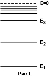 Изолированный атом характеризуется серией энергетических уровней. У каждого элемента имеется характерная для него совокупность уровней − энергетический спектр (рис.1). Заполнение уровней электронами определяется принципом минимума энергии и принципом Паули. При Т= 0 К "заполняются" уровни с наименьшей энергией (принцип минимума энергии). На одном уровне не может находиться более двух электронов с одинаковыми квантовыми числами n,l,m (принцип Паули).