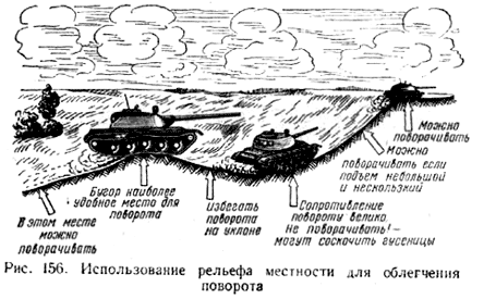 На твердых грунтах, на местности, покрытой травой или неглубоким снегом, танк на низших передачах поворачивается легко. Без труда поворачивается он на подъемах и на некрутых спусках с твердым грунтом (рис. 156).
