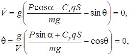 Всего имеется 2 алгебраических нелинейных уравнения, а неизвестных параметров 3: угол атаки, скорость полета и тяга двигателя. Порядок вычислений может быть таким. Поскольку при