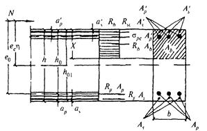 Рисунок 7.4 - Схема усилий и эпюра напряжений в сечении, нормальном к продольной оси внецентренно сжатого железобетонного элемента, при расчете его по прочности