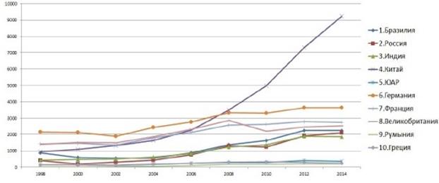 Глядя на ВВП России, Индии и Китая в группе стран ЕС и БРИКС (табл. 1, график 1), можно сказать, что в начале рассматриваемого периода (1998г.) лидирующее положение занимала Германия – 2157 млрд. долл., затем примерно на одном уровне следовали Великобритания и Франция – около 1400 млрд. долл. Самое низкое значение ВВП в 1998 году было у Румынии. В 2002 г. Китай достиг уровня Великобритании и Франции, который к этому периоду достиг 1320 млрд. долл. А уже в 2007-2008 гг. обогнал по уровню ВВП Германию и к 2014 году совершил колоссальный скачок до 9240,27 млрд. долл., что в 3,4 раза больше отстающей от него Германии. Россия и Индия имели приблизительно равное значение ВВП в 2010 году, но в 2012-2014 гг. Россия опередила Индию по данному показателю [15].