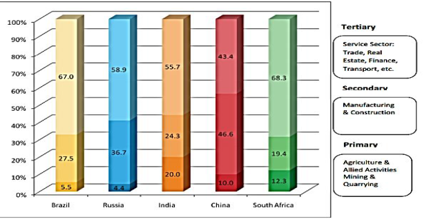 Рассматривая распределение ВВП по секторам экономики в России, Китае и Индии БРИКС (график 4), можно отметить, что во всех странах, кроме Китая, преобладающую часть занимает сектор услуг (торговля, недвижимость, финансы, транспорт). Так в России сектору услуг принадлежит 58,8% от ВВП, Индии – 55,7%, а Китаю – 43,3%. Сектору, включающему в себя производство и строительство, в Китае принадлежит 46,6% от ВВП, России – 36,7%, Индии – 24,3%. Что касается добывающей промышленности, то в России – 4,3%, в Китае – 9,3%, в ЮАР – 3,5% (табл. 2.5). Для Индии имеется только суммарная доля добывающей промышленности и сельского хозяйства, она составляет 20,0%. Сектору сельского хозяйства в России принадлежит 0,1%, Китаю – 0,7% [15].