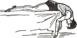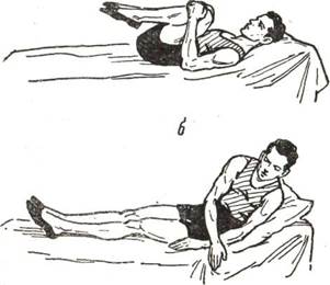 Перед началом занятий лечебной гимнастикой больному «а 5—10 минут необходимо принять так называемое дренажное положение. Время пребывания в таком положении надо увеличивать постепенно. Если отделяемого секрета много, а больной достаточно привык к дренажному положению, дренирование может продолжаться до 30—40 минут; чтобы избежать затекания отделяемого в здоровое легкое, мы рекомендуем заканчивать эту процедуру дренированием здорового легкого (рис. 9, а, б, в).