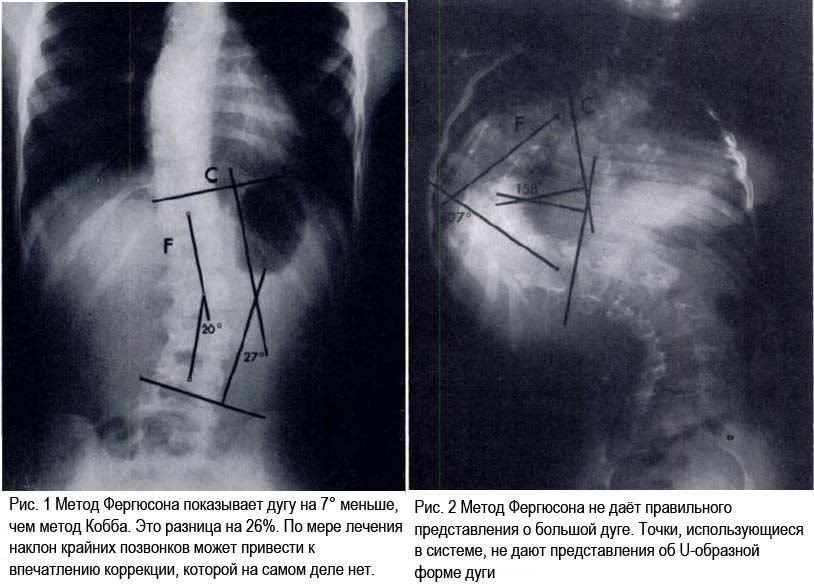 Метод Фергюсона представляет саму дугу и наклон крайних позвонков не влияет на показатели. Очень часто велик соблазн использовать метод Кобба, потому что он даёт иллюзию достижения блольшей корекции в процессе лечения.
