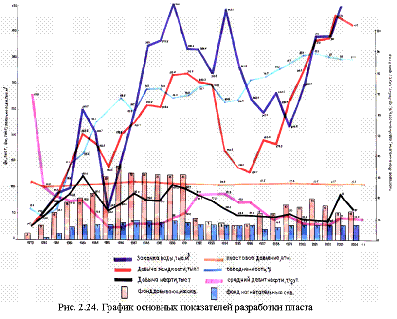 На рис. 5.3 показаны фактические графики основных показателей разработки пласта из которых следует, что добыча нефти (линия чёрного цвета) по годам с 1979 года по 2004 год сначала возрастала, а затем падала. Возрастание добычи нефти с 2002 года объясняется повышением объёма закачиваемой воды в пласт для поддержания пластового давления (синяя линия). Также заметно повышение добываемой пластовой жидкости (красная линия). Обращает на себя внимание постоянство пластового давления (коричневая линия) благодаря закачке воды в пласт.