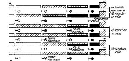 Кодові сигнали несуть інформацію про допустиму швидкість зближення поїзда з колійними сигналами автоблокування (рис. 7.1, а) і електричної централізації (ЕЦ) (рис. 7.1, б). У маршрутах руху боковими коліями станційні рейкові кола кодуються для забезпечення роботи АЛСН (див. рис. 7.1, б) тільки при використанні в цих маршрутах стрілочних переводів з пологими марками хрестовин, в інших випадках станційні рейкові кола в маршрутах руху боковими коліями, як правило, не кодуються. Маршрути руху, які організовуються за дозволяючими показами колійних сигналів, головними коліями завжди кодуються не залежно від типу хрестовин у стрілочних переводах.