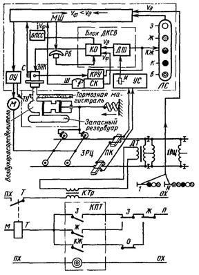 Поряд з об'єктивним (автоматизованим) контролем швидкості машиністові надається можливість вести поїзд при суб'єктивному контролі як фактичної швидкості vф (за шкалою Ш швидкостеміра), так і допустимої швидкості vд (за показами вогнів локомотивного світлофора ЛС). Зіставляючи значення швидкостей vф та vд, машиніст через органи управління ОУ (кран машиніста й ін.) впливає на гальмівні пристрої ТУ і силові механізми М поїзда.
