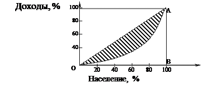 Доходы населения каждой страны в условиях рыночной экономики чрезвычайно дифференцированы. Для оценки степени дифференциации доходов используют графики и коэффициенты. Графиком, показывающим степень дифференциации доходов, служит кривая Макса Лоренца (рис.14).