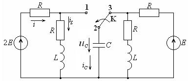 Задача 4.2.2. В электрической цепи (см. рисунок 4.4) с постоянным источником ЭДС Е = 60В в момент времени t = 0 одновременно ключ К1 замыкается, а ключ K2 размыкается. Параметры цепи: резисторы R1=30 Ом, R2=70Ом, R3=30 Ом, индуктивность L = 10 мГн, емкость C = 2 мкФ.