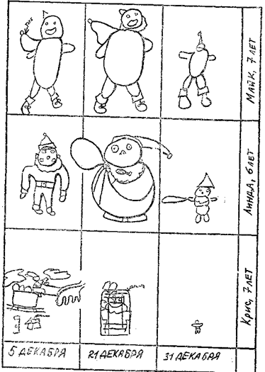 Влечения, потребности, установки, стремления и желания человека — вот, казалось бы, самый проверенный материал для того, чтобы заставить статую личности двигаться и действовать. Нередко говорят, что каждый человек видит в мире то, что он хочет увидеть, принимает желаемое за действительное. Дон Кихот, стремящийся встретиться с великанами, принимает за великанов ветряные мельницы и нападает на них. Африканец, оказавшись во власти сформированных в его жизни установок, в день приезда в Лондон ошибочно думает, что все полицейские дружественно настроены по отношению к нему, так как принимает знак остановки транспорта — правую руку полицейского, поднятую ладонью вверх навстречу движущемуся транспорту, — за теплое приветствие. Потребности и установки человека определяют избирательность восприятия и мышления, пристрастность процесса познания мира, давая о себе знать, когда их влияние на действительность становится слишком заметным. Психологи одного направления, известного в психологии под названием «New Look» («Новый взгляд»), охарактеризовали потребности, установки и желания как «личностные факторы» познания и попытались через изучение влияния этих личностных факторов на познавательные процессы человека судить об его личности[5]. Например, представители «New Look» провели следующий весьма иллюстративный эксперимент, убедительно демонстрирующий роль личностных факторов в процессе познания. Они попросили детей нарисовать изображение Санта Клауса (Деда Мороза) 5 декабря, 21 декабря, 31 декабря. Оказалось, что чем ближе был праздник, тем больше места на карточке занимал Санта Клаус, тем больше набухал мешок с подарками у него за плечами. После встречи с Санта Клаусом его изображение на карточке резко уменьшилось (рис. 1). Путь, предложенный представителями «New Look» для строительства личности, заманчив. Потребности и установки человека — факторы, детерминирующие избирательность восприятия мира, направленность поведения человека. Но и этот путь, реально показывающий теснейшую связь мотивационно-потребностной сферы человека с познавательными процессами, не приводит к ответу на вопрос, что такое личность. Потребность в безопасности, потребность в комфорте, потребность в любви, потребность в познании, потребность в самовыражении. Список потребностей и влечений разнообразен. Исследователи, перечисляя одну за другой потребности личности, узнают лишь сами эти потребности, а представление о личности превращается в по-разному сконструированную конфигурацию нужд человека, его стремлений и желаний.
