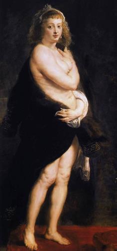 «Шубка», 1638 - Елена предстает обнаженной, стоящей на красном ковре, с накинутой на плечи шубкой. Портрет построен на тончайших цветовых нюансах, на контрасте густого коричневого меха с бархатистостью кожи, с легкостью пронизанных воздухом волос, с влажностью блестящих глаз. Тело женщины написано с потрясающей реалистической силой. Это очень личное, интимное изображение, но, как во всяком большом произведении, в нем есть обобщающая мысль: Рубенс славит женщину как символ жизни.