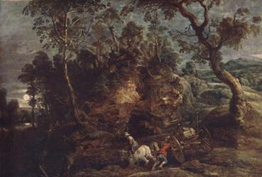 Пейзаж Рубенса развивает нидерландские традиции, придавая им новый идейный смысл и художественное значение. Он решает главным образом задачу обобщенного изображения природы как целого; величавая картина бытия мира, ясной гармонии человека и природы получает у него свое возвышенно поэтическое и вместе с тем чувственно полновесное воплощение. Мир есть целое, и человек спокойно и радостно ощущает свое единство с ним. Более ранние из пейзажей Рубенса, например «Возчики камней» (ок. 1620; Эрмитаж), отличаются несколько большим драматизмом композиции.