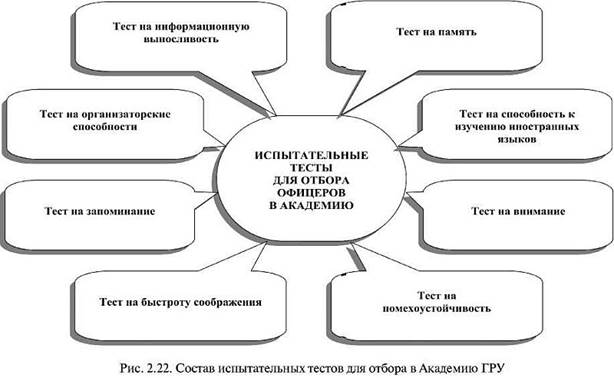 По приезде в Москву отобранные представителями ГРУ кандидаты перед сдачей экзаменов подвергаются проверке с помощью многообразных испытательных тестов. Часть этих тестов, а их достаточно большое количество, приведена на рис. 2.22. Среди них имеются тесты на память, на способность к изучению иностранных языков, на внимание, на «помехоустойчивость». Как правило, кандидаты проходят через сотни тестов, с 9 часов утра до 17 часов вечера в течение целой недели.