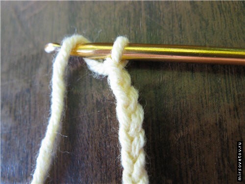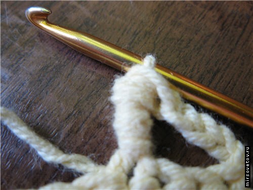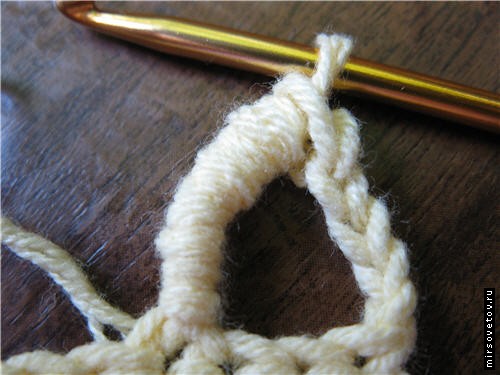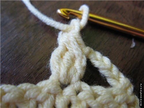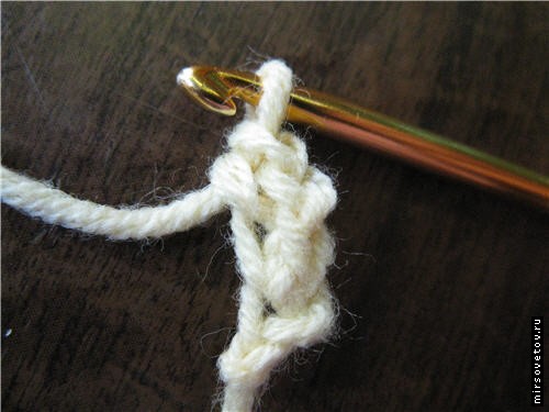 - двойная цепочка основания. Две воздушные петли, сбн в первую петлю, ввести крючок под левую перемычку последнего столбика, накид, вытянуть петлю, накид, протянуть через 2 петли на крючке;