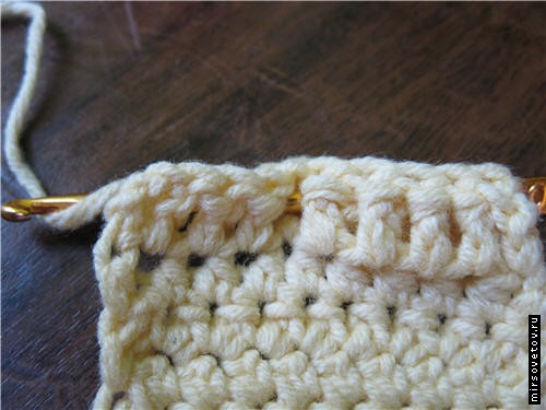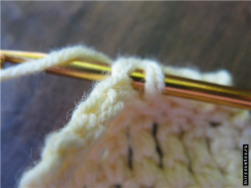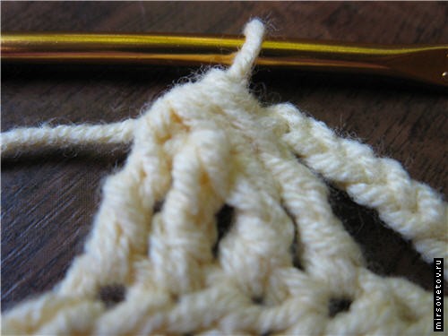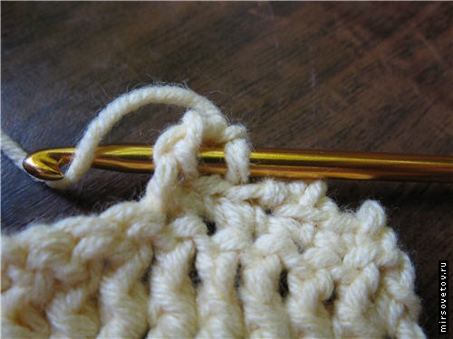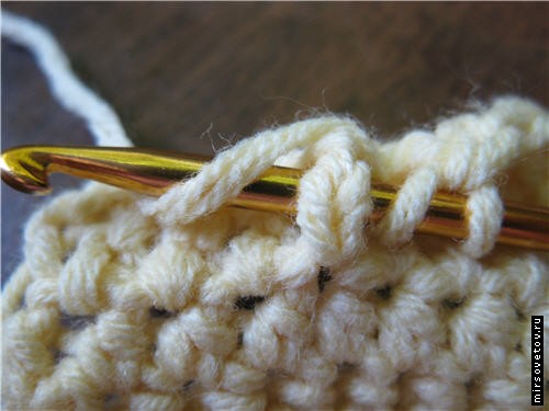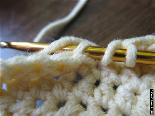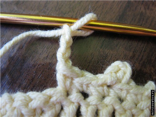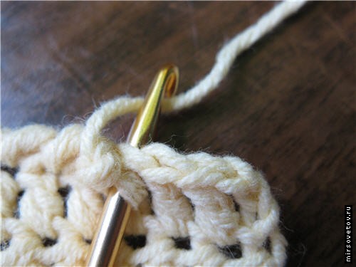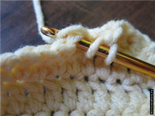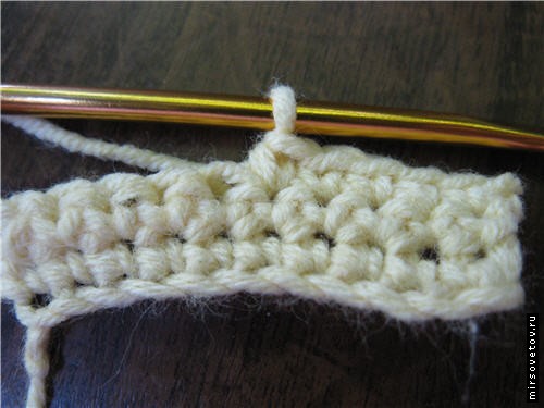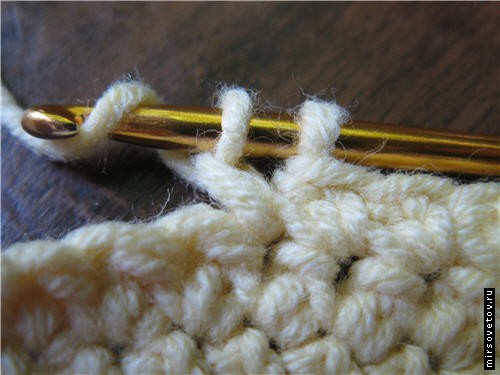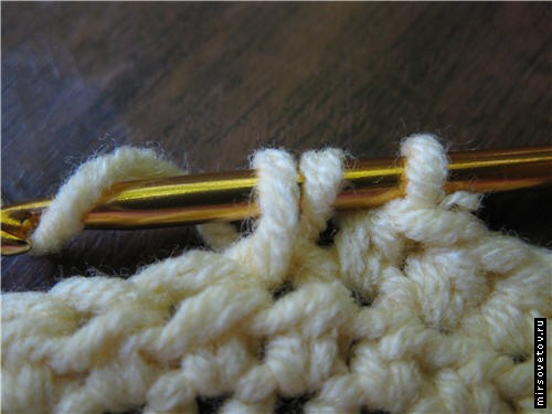 Накид, завести крючок в ближайший сбн основания, вытянуть петлю, накид, протянуть через 2 петли на крючке, накид, протянуть через 2 петли на крючке;