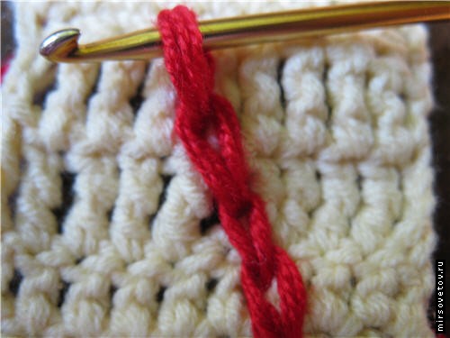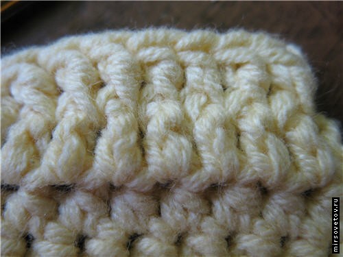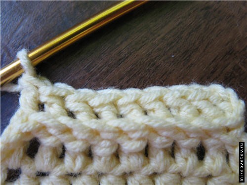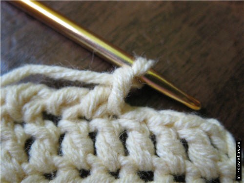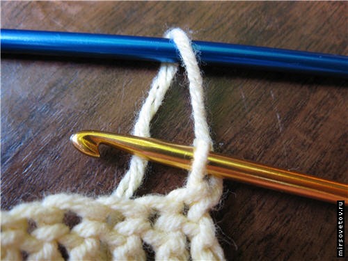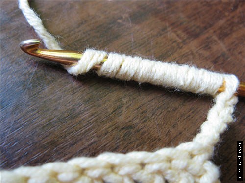 - обвитый столбик (ОС или ос). Несколько накидов (10 и более можно), завести крючок, вытянуть петлю через все накиды;